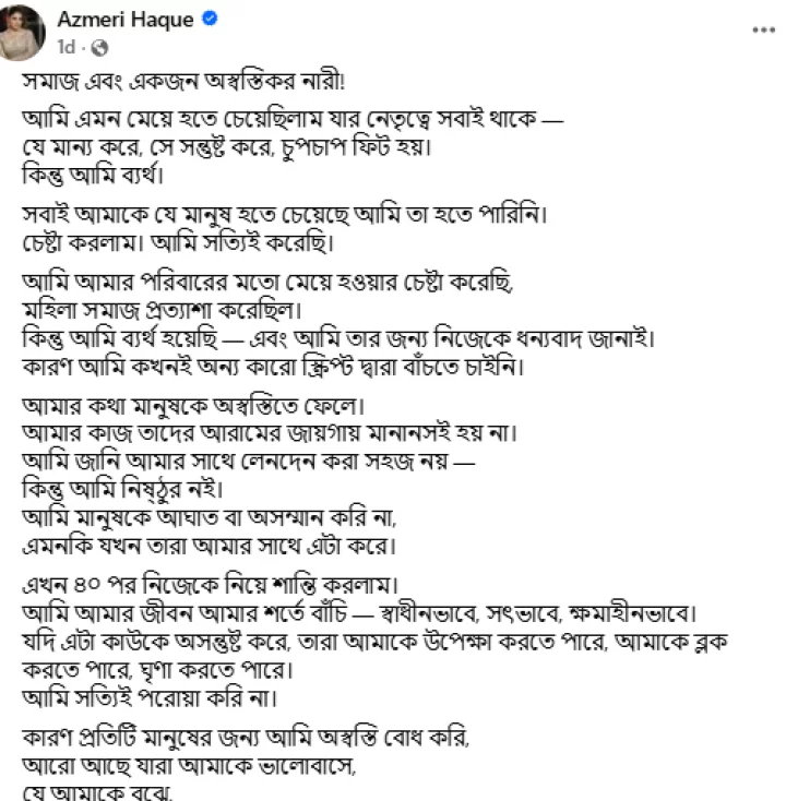 আর সবথেকে গুরুত্বপূর্ণ হলো আমি নিজেকে ভালোবাসি। আমি ভেঙে যাইনি। আমি কেবল সেই পৃথিবীর জন্য অস্বস্তিকর যে পৃথিবী আসল নারীদের ভয় পায়। আমি তোমাকে ভালোবাসি, আজমেরী হক বাঁধন সেই নারী যাকে তুমি অবশেষে হওয়ার সিদ্ধান্ত নিয়েছ।’