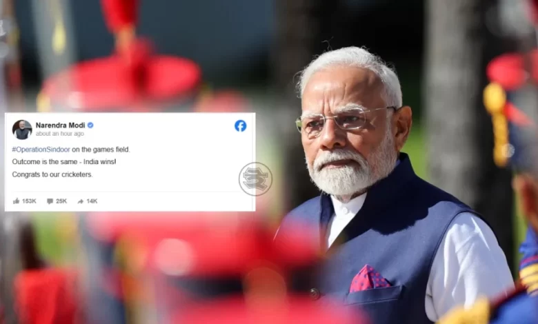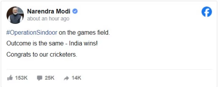 গতকাল রোববার (২৮ সেপ্টেম্বর) রাতে দেওয়া ওই স্ট্যাটাসে মোদি লিখেন, ‘খেলার মাঠে অপারেশন সিঁদুর। ফলাফল একই – ভারত জিতেছে! অভিনন্দন আমাদের ক্রিকেটারদের।’