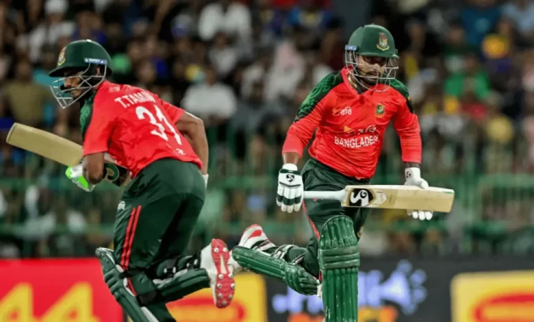 সিরিজ জয়ের লক্ষ্যে নেমে ওপেনিং জুটিতে ৫.৩ ওভারে ৪০ রান করে বাংলাদেশ। ফিরে যাওয়ার আগে পারভেজ ইমন ২১ বলে তিন চার ও এক ছক্কায় ২৩ রান করে ফিরে যান। পরের পথ পাড়ি দেন তানজিদ তামিম ও লিটন দাস। তানজিদ ৪০ বলে ৫৪ রানের হার না মানা ইনিংস চারটি চার ও দুটি ছক্কার শটে সাজান। লিটন ১৮ বলে দুই চারে অপরাজিত ১৮ রান করেন।