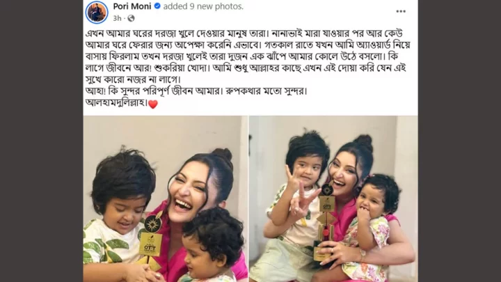 তার কথায়, ‘গতকাল রাতে যখন আমি অ্যাওয়ার্ড নিয়ে বাসায় ফিরলাম তখন দরজা খুলেই তারা দুজন এক ঝাঁপে আমার কোলে উঠে বসলো। কি লাগে জীবনে আর! শুকরিয়া খোদা।’