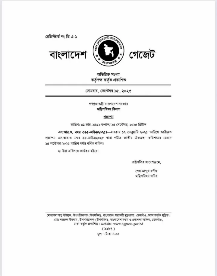 এর আগে জাতীয় ঐকমত্য কমিশনের মেয়াদ ১৫ সেপ্টেম্বর পর্যন্ত বাড়িয়ে প্রজ্ঞাপন জারি করা হয়েছে।