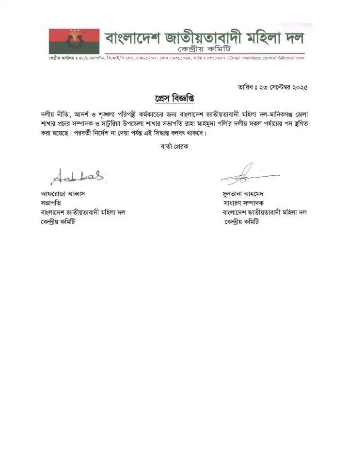 অনলাইন ডেস্ক: মানিকগঞ্জ জেলা শাখার প্রচার সম্পাদক ও সাটুরিয়া উপজেলা শাখার সভাপতি রাহা মাহমুদা পলির দলীয় সকল পর্যায়ের পদ স্থগিত করেছে বাংলাদেশ জাতীয়তাবাদী মহিলা দল।