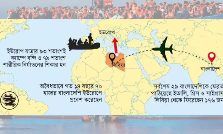 অবৈধপথে যাওয়া ব্যক্তিদের ৯৩ শতাংশই ক্যাম্পে বন্দি হন : ব্র্যাকের এক গবেষণায় দেখা গেছে, অবৈধভাবে ইউরোপ যাওয়ার পথে ৯৩ শতাংশই ক্যাম্পে বন্দি হন আর ৭৯ শতাংশ শারীরিক নির্যাতনের শিকার হন। ইউরোপের সীমান্তরক্ষী বাহিনীর সমন্বয়ের দায়িত্বে থাকা ফ্রন্টেক্সের তথ্য বলছে, লেবানন হয়ে ভূমধ্যসাগর পাড়ি দিয়ে সবচেয়ে বেশি ইউরোপে যাওয়ার চেষ্টা করে বাংলাদেশিরা। ২০০৯ সাল থেকে ২০২৩ সাল পর্যন্ত এই রুটে প্রায় ৭০ হাজারেরও বেশি বাংলাদেশি ইউরোপে প্রবেশ করেছে। লিবিয়া ফেরত ৫৫৭ জনের বাংলাদেশির তথ্য বিশ্লেষণ করে বেসরকারি সংস্থা ব্র্যাক বলেছে, তাদের ৬০ শতাংশের পরিবারকে স্থানীয় দালালরা প্রলোভন দেখিয়ে নিয়ে যায়। যাদের ৮৯ শতাংশই নানা ঝুঁকিতে পড়েছেন। অভিবাসন বিশেষজ্ঞরা বলছেন, বিদেশ যাওয়ার স্বপ্নযাত্রা যেন মৃত্যুযাত্রায় পরিণত না হয়, তার জন্য সচেতনতা যেমন জরুরি, তেমনি এই সংকট কাটাতে দালাল চক্রের বিরুদ্ধে যথাযথ আইনের প্রয়োগ প্রয়োজন।
