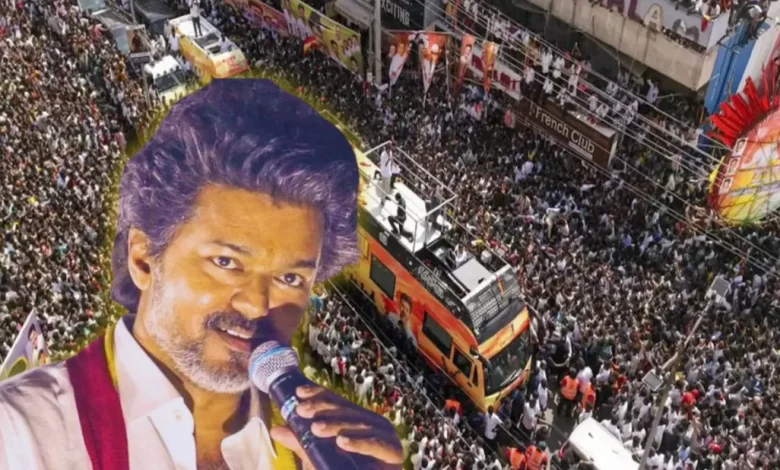 ভারতীয় সংবাদমাধ্যমের রিপোর্ট অনুসারে, জনসভায় অনেক বেশি ভিড় হয়েছিল। উদ্যোক্তারা আশা করেননি এত লোকের জমায়েত হবে। বিজয় বক্তৃতা দিতে উঠতেই ভিড় ক্রমশ বাড়তে থাকে। তার ফলেই জনতার মধ্যে হুড়োহুড়ি শুরু হয়। পরিস্থিতি সামাল দিতে গিয়ে কয়েকজন দলীয় কর্মী অসুস্থ হয়ে পড়েন। কয়েকটি শিশু জ্ঞান হারায়। দ্রুত অসুস্থদের উদ্ধার করে অ্যাম্বুল্যান্সে করে হাসপাতালে পাঠানো হয়।