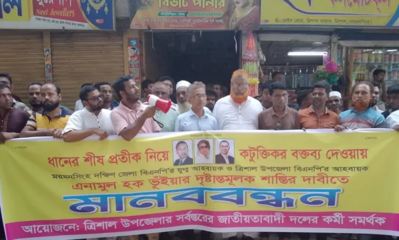 ত্রিশালে ধানের শীষ প্রতীক নিয়ে কটুক্তিকর বক্তব্যের প্রতিবাদে মানববন্ধন