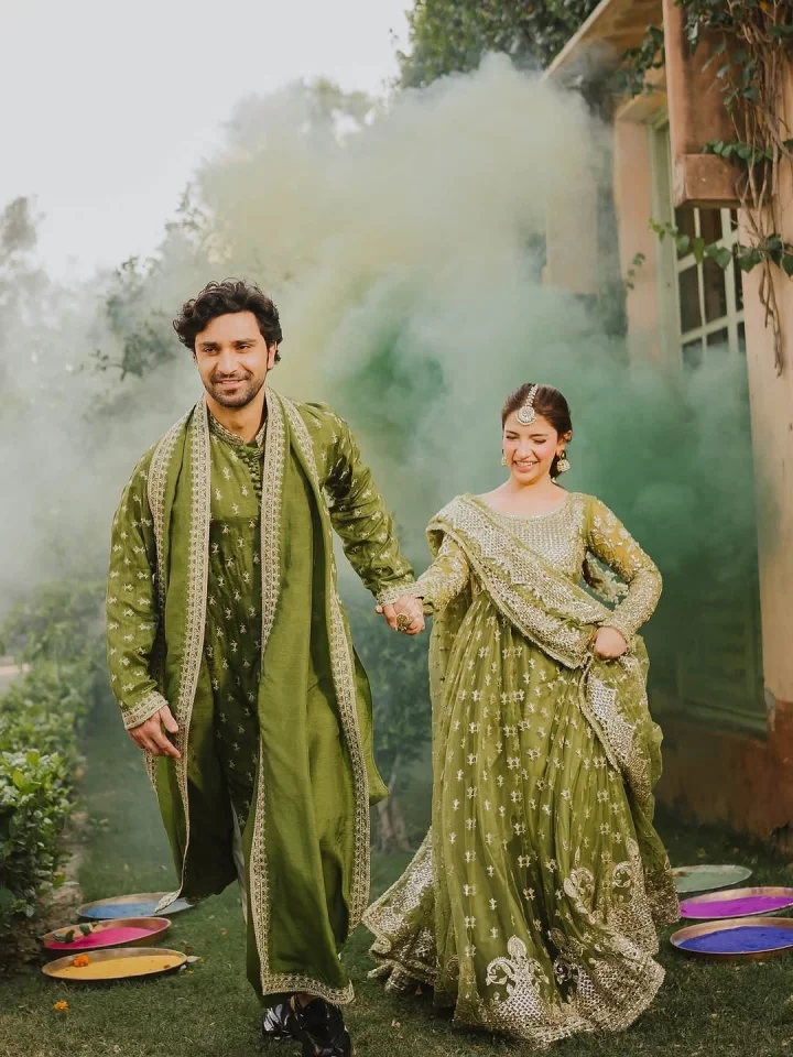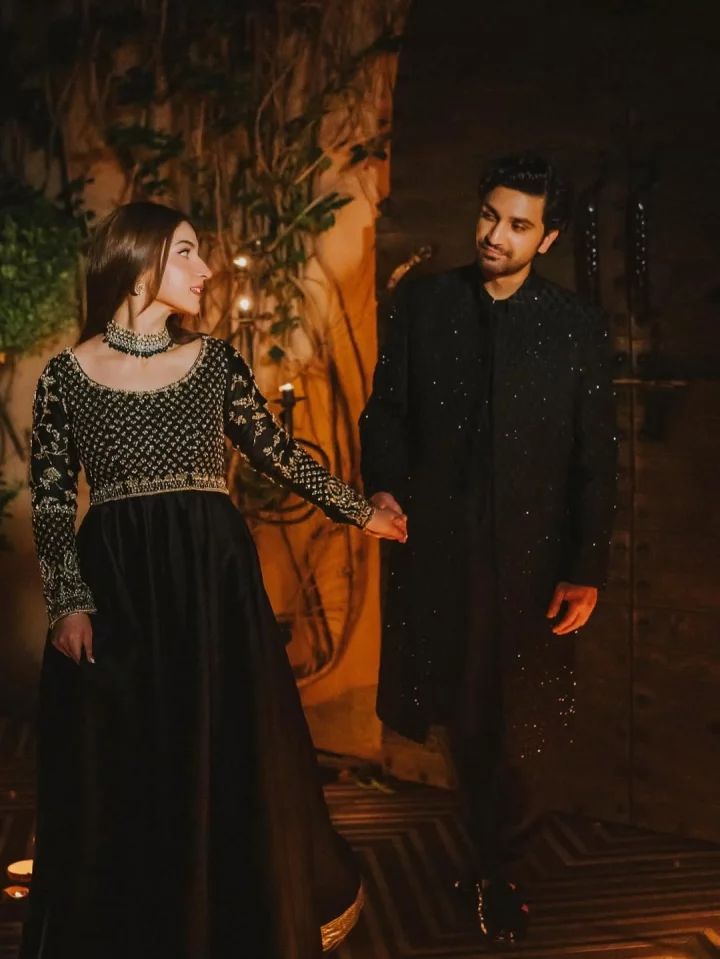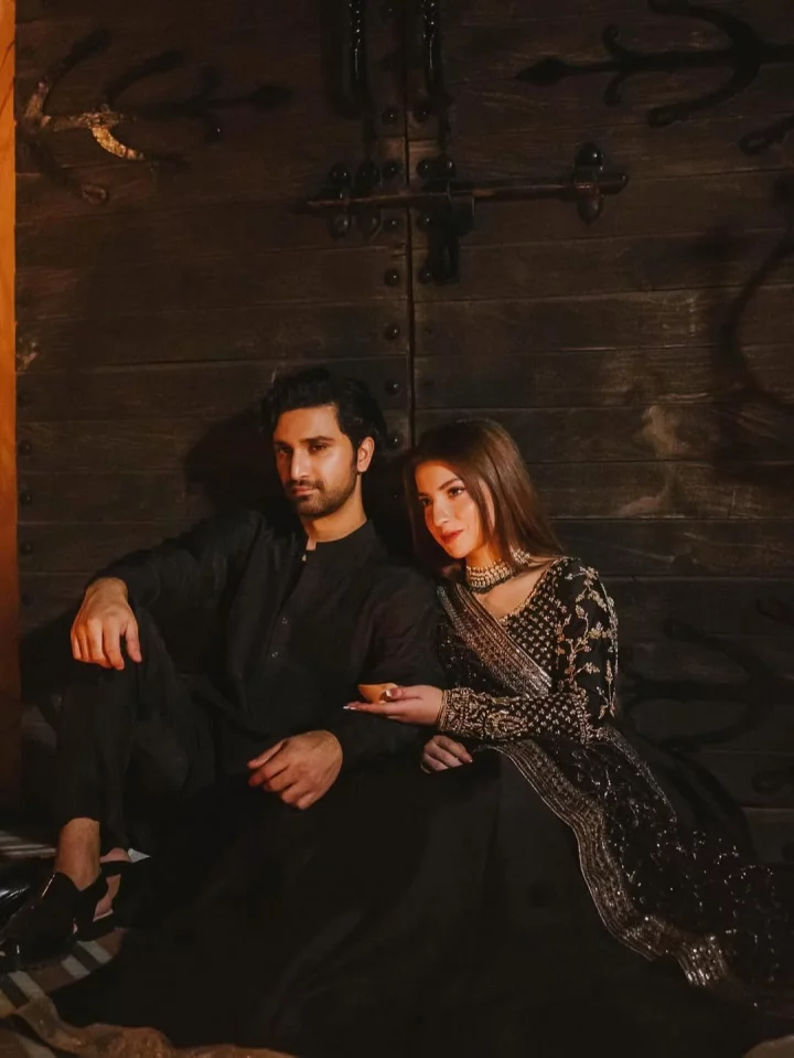 ফটোশুটে দানানির মোবিন সোনালি কারুকাজ করা কালো অনারকলি পরেছেন, আহাদ সূক্ষ্ম কারুকাজ করা কালো শেরওয়ানি পরেছেন।