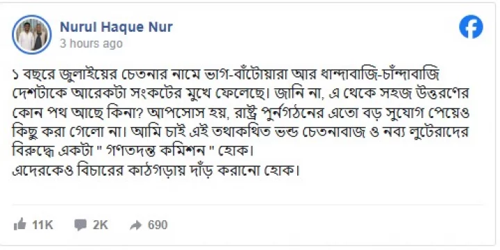 কোনো ব্যক্তি বা দলের নাম উল্লেখ না করে নুরুল হক আরও লেখেন, ‘আমি চাই এই তথাকথিত ভণ্ড চেতনাবাজ ও নব্য লুটেরাদের বিরুদ্ধে একটা গণতদন্ত কমিশন হোক। এদেরকেও বিচারের কাঠগড়ায় দাঁড় করানো হোক।’