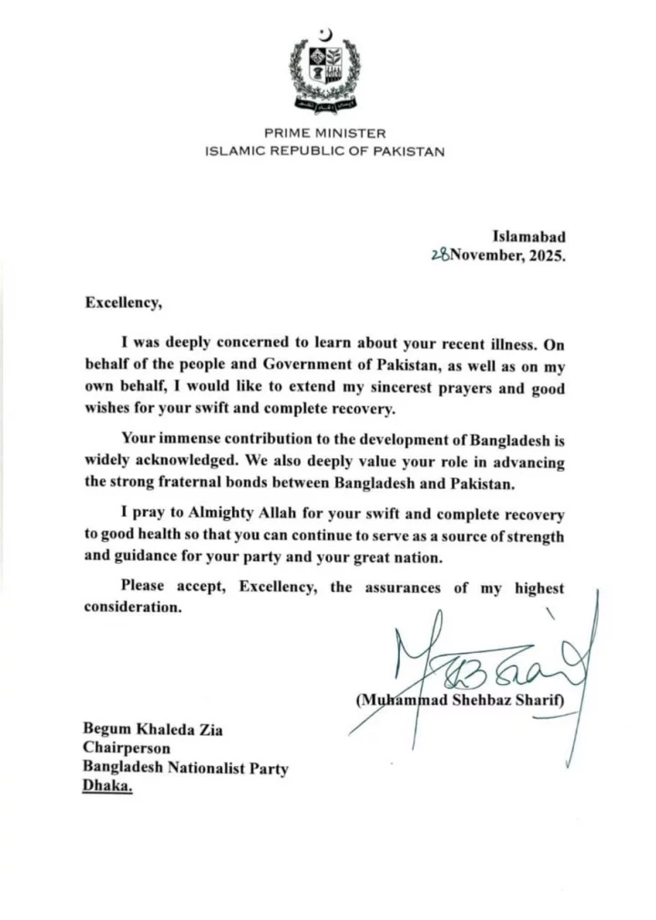 চিঠিতে পাকিস্তানের প্রধানমন্ত্রী মুহাম্মদ শেহবাজ শরীফ লেখেন, আপনার সাম্প্রতিক অসুস্থতার খবর জেনে আমি গভীরভাবে উদ্বিগ্ন। পাকিস্তানের জনগণ, সরকার, পাশাপাশি আমার ব্যক্তিগত পক্ষ থেকেও আপনার দ্রুত ও সম্পূর্ণ সুস্থতার জন্য আন্তরিক প্রার্থনা ও শুভকামনা জানাচ্ছি।