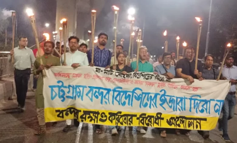 লালদিয়া কনটেইনার টার্মিনাল বিদেশিদের কাছে ইজারার প্রতিবাদে মশালমিছিল