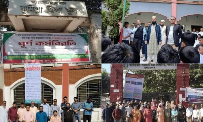 এদিকে এন্ট্রি–পদের বেতন ৯ম গ্রেডসহ চার দফা দাবিতে দুই দিনের অবস্থান কর্মসূচি ও আলটিমেটাম শেষে কোনো সমাধান না পেয়ে সোমবার থেকে পূর্ণদিবস কর্মবিরতি শুরু করেছে বাংলাদেশ সরকারি মাধ্যমিক শিক্ষক সমিতি। কর্মসূচির অংশ হিসেবে মাধ্যমিকের বার্ষিক পরীক্ষা, এসএসসি নির্বাচনী পরীক্ষা এবং খাতা মূল্যায়ন থেকেও শিক্ষকরা বিরত থাকবেন।