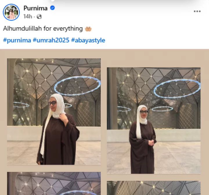 এরপর হ্যাশট্যাগ দিয়ে পূর্ণিমা, ওমরাহ ২০২৫ ও আবায়া স্টাইল শব্দগুলো জুড়ে দেন তিনি।