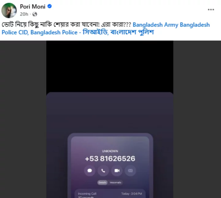 এ বিষয়ে পরীমণি বলেন, হুট করে একটি বিদেশি নম্বর থেকে আমাকে কল দিয়েই বিভিন্ন গালিগালাজ শুরু করেন। পাশাপাশি ভোট নিয়ে কিছু বলা ও সোশ্যাল মিডিয়ায় কিছু শেয়ার করা যাবে না বলে আমাকে হত্যার হুমকি দেয়।