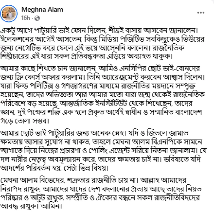 তিনি আরও লেখেন, ‘আমার ছোট ভাই পাটুয়ারির জন্য অনেক স্নেহ। যদি ও জিতলে জামাত ক্ষমতায় আসার সুযোগ না থাকত, তাহলে মেঘনা আলম বিএনপিকে সামনে আগাতে দিয়ে নিজের প্রচারণা ও পোলিং এজেন্ট সরিয়ে নিতনা জানালাম। যে দল নারীর নেতৃত্ব অবমূল্যায়ন করে, তাদের ক্ষমতায় চাই না। ভবিষ্যতে যদি আদর্শের পরিবর্তন হয়, সেটা ভিন্ন বিষয়।’
