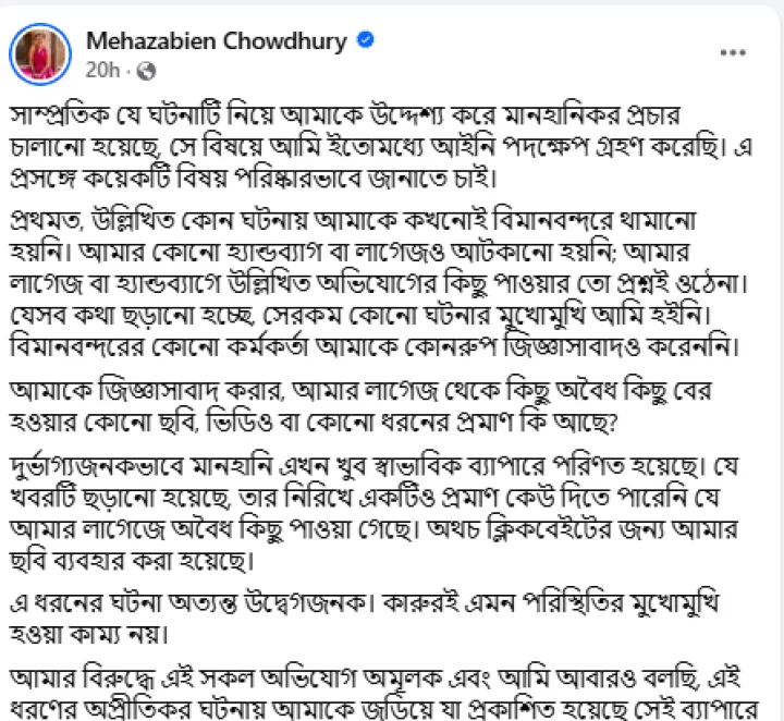 পোস্টে তিনি লেখেন, বর্তমানে মানহানি যেন খুব স্বাভাবিক বিষয় হয়ে দাঁড়িয়েছে। তার অভিযোগ, কোনো প্রমাণ ছাড়াই ক্লিকবেইট তৈরির উদ্দেশ্যে তার ছবি ব্যবহার করে বিভ্রান্তিকর খবর প্রকাশ করা হয়েছে, যা অত্যন্ত উদ্বেগজনক।