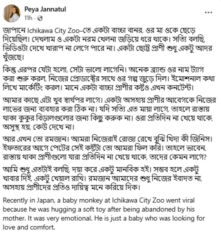 এক পোস্টে পিয়া লিখেন, ‘দেখলাম ও (বাচ্চা বানর) একটা নরম খেলনা জড়িয়ে ধরে থাকে। সত্যি বলছি, ভিডিওটা দেখে খারাপ না লেগে পারে না। একটা ছোট্ট প্রাণী শুধু একটু আদর খুঁজছে। কিন্তু এরপর যেটা হলো, সেটা ভালো লাগেনি। অনেক ব্র্যান্ড ওর নাম ট্যাগ করা শুরু করল, নিজের প্রোডাক্টের সাথে ওর গল্প জুড়ে দিল।’