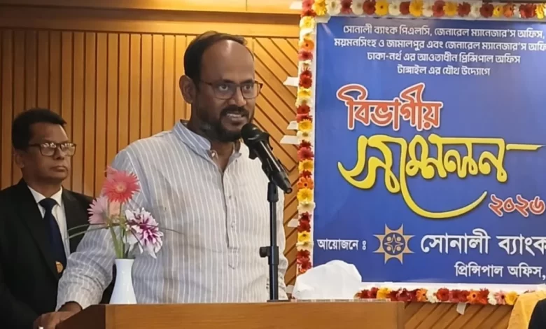 সোনালী ব্যাংক পিএলসির উদ্যোগে আয়োজিত বিভাগীয় সম্মেলনে প্রধান অতিথি হিসেবে বক্তব্য দেন প্রতিমন্ত্রী সুলতান সালাউদ্দিন টুকু।