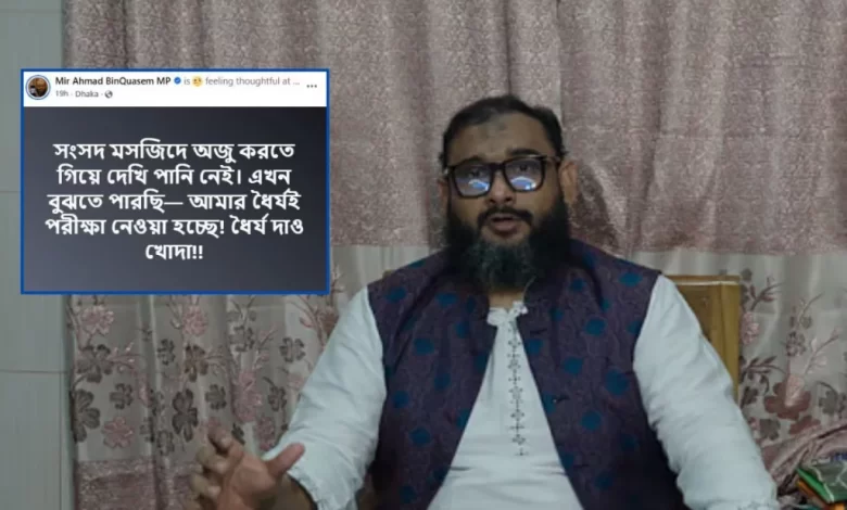 অনলাইন ডেস্ক: জাতীয় সংসদের মসজিদে অজু করতে গিয়ে পানি পাননি ঢাকা-১৪ আসনের সংসদ সদস্য (এমপি) ব্যারিস্টার মীর আহমেদ বিন কাসেম আরমান।