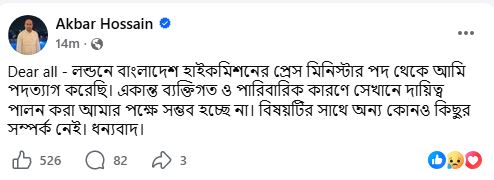 ওই পোস্টে আকবর হোসেন লিখেছেন, “Dear all—লন্ডনে বাংলাদেশ হাইকমিশনের প্রেস মিনিস্টার পদ থেকে আমি পদত্যাগ করেছি। একান্ত ব্যক্তিগত ও পারিবারিক কারণে সেখানে দায়িত্ব পালন করা আমার পক্ষে সম্ভব হচ্ছে না। বিষয়টির সঙ্গে অন্য কোনো কিছুর সম্পর্ক নেই। ধন্যবাদ।”